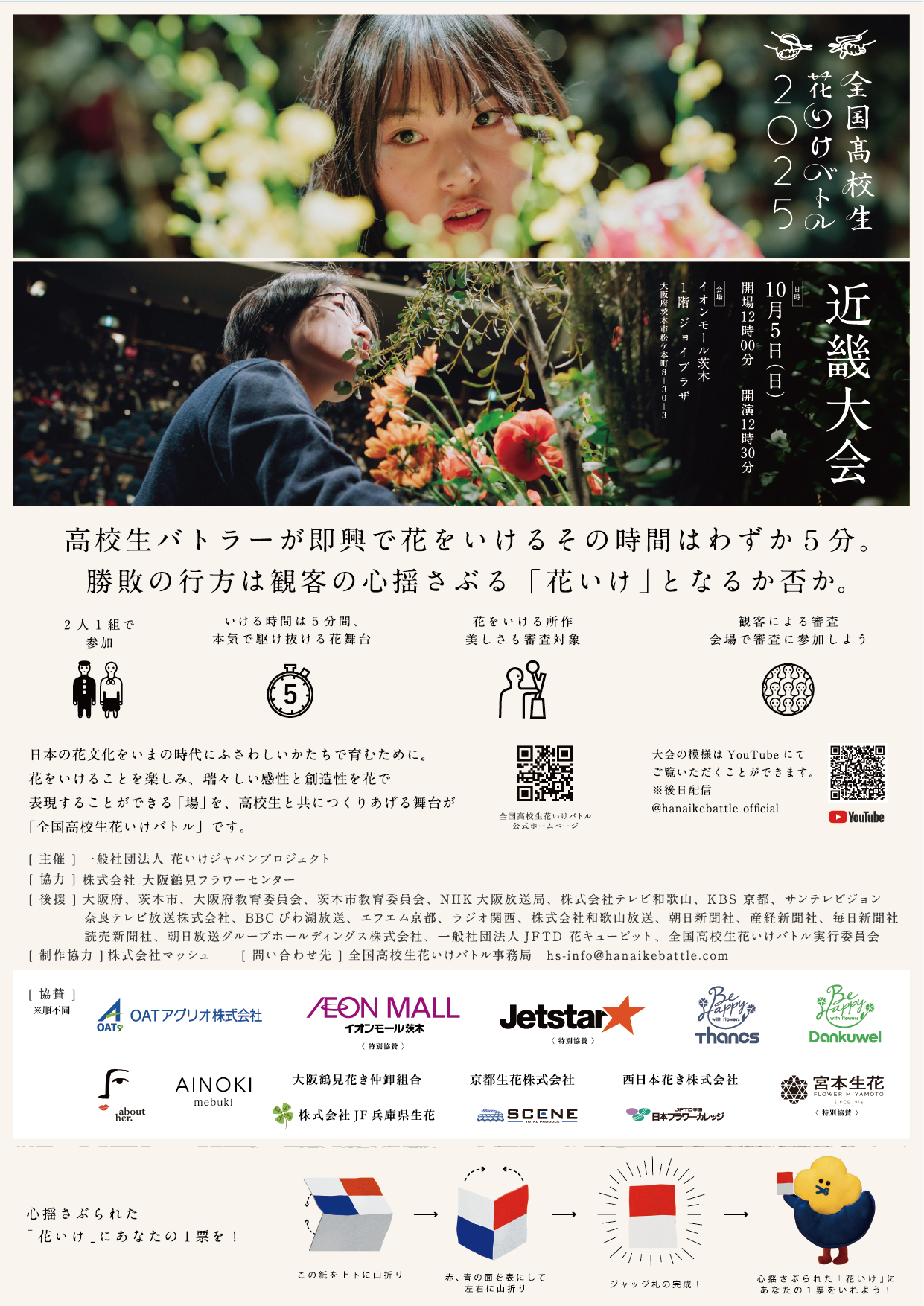 【 後援 】大阪府、茨木市、大阪府教育委員会、茨木市教育委員会、NHK大阪放送局、株式会社テレビ和歌山、KBS 京都、サンテレビジョン、奈良テレビ放送株式会社、BBCびわ湖放送、エフエム京都、ラジオ関西、株式会社和歌山放送、朝日新聞社、産経新聞社、毎日新聞社、読売新聞社、朝日放送グループホールディングス株式会社、一般社団法人JFTD 花キューピット、全国高校生花いけバトル実行委員会