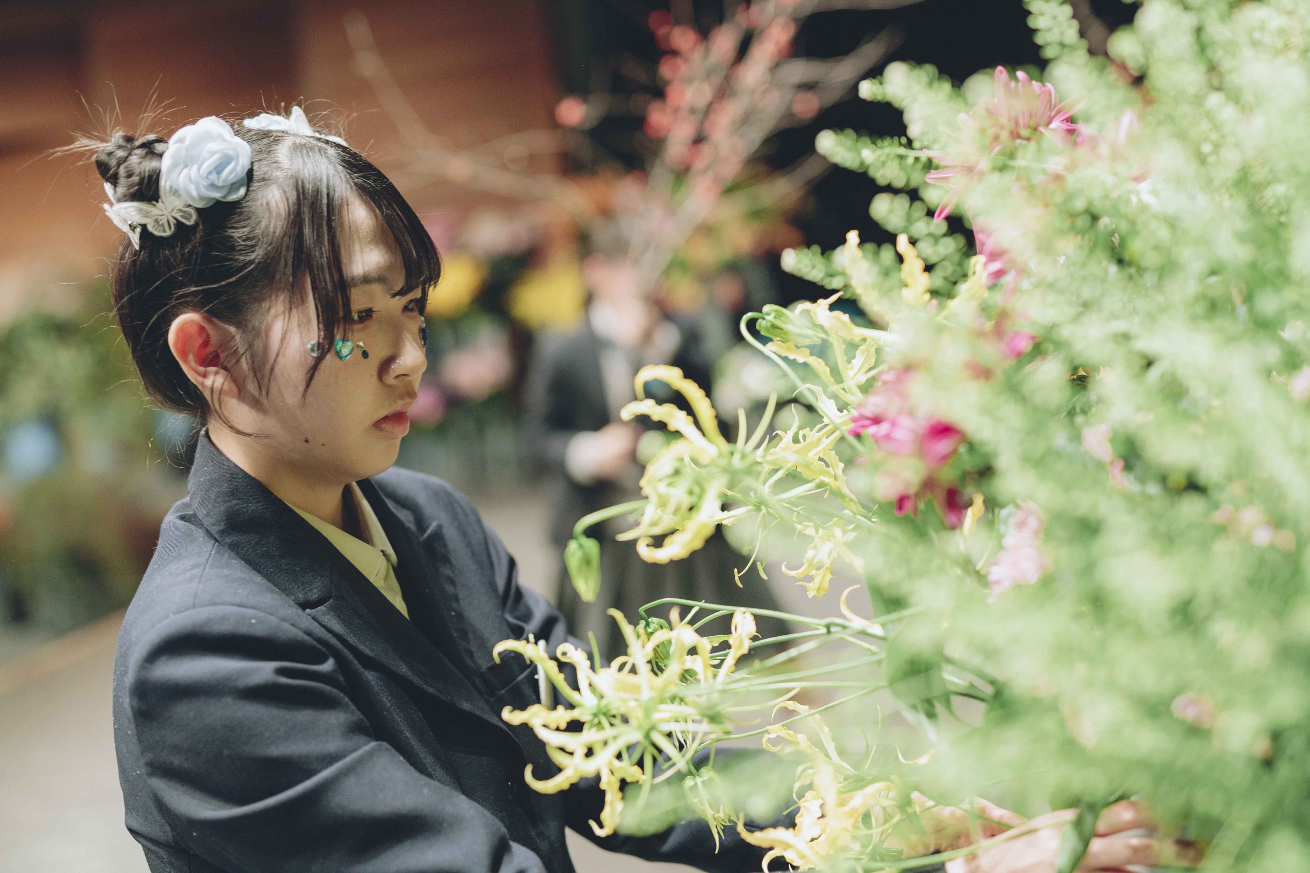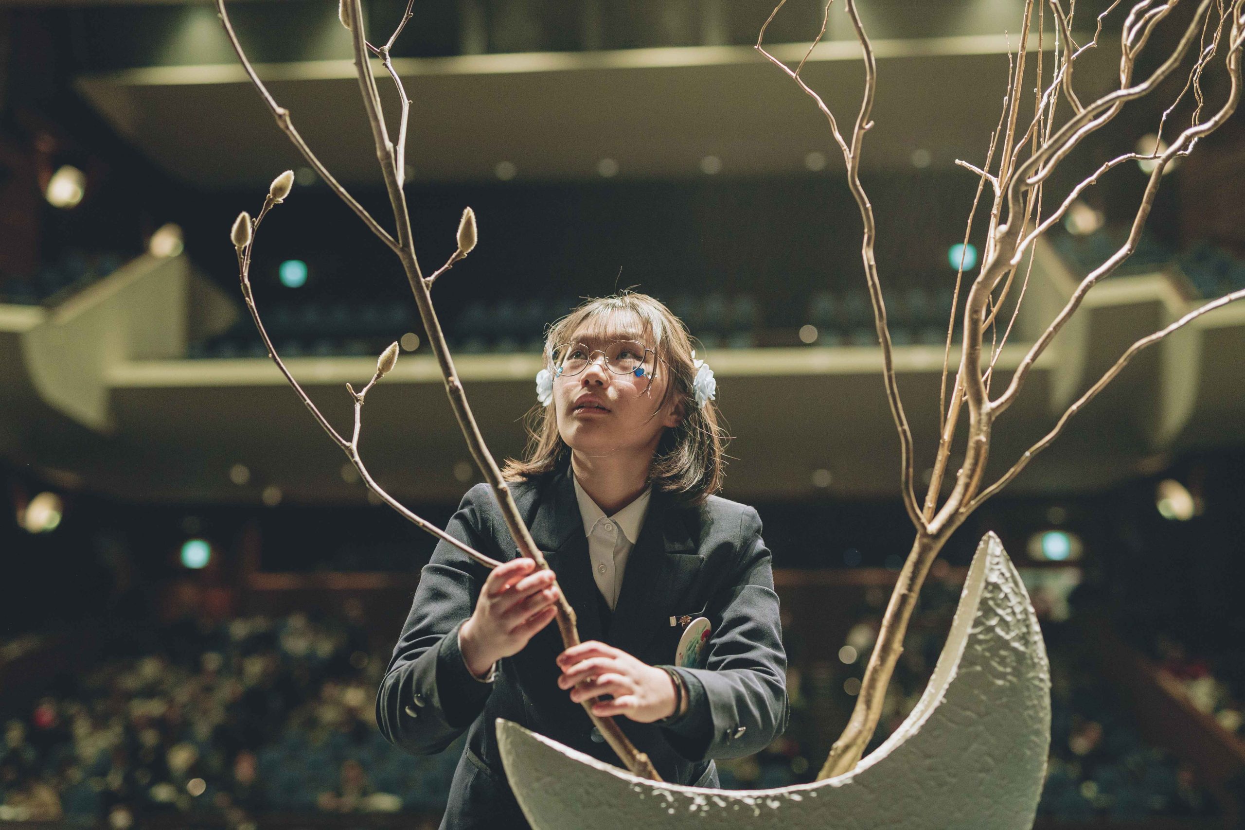 準決勝の対戦相手は、今大会優勝を果たした正則学園高等学校「忠央口」。善戦するも一歩及ばず準決勝敗退となり、最後に臨んだのは第3位決定戦。際立つ作品構成力を携え、自信をもって堂々と花をいける姿が印象的だった「百はな」が勢いにのり、見事第3位決定戦を制しました。
