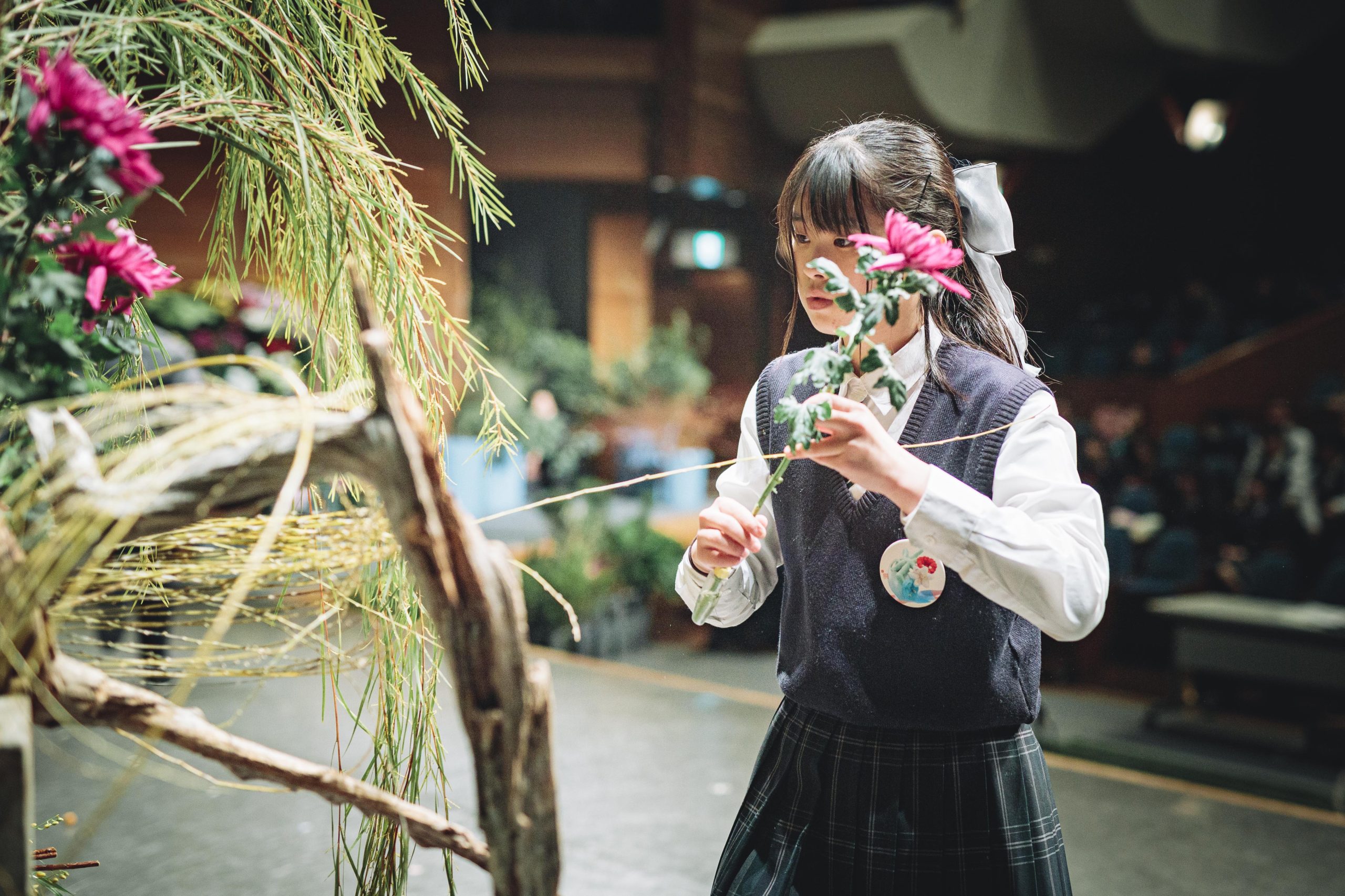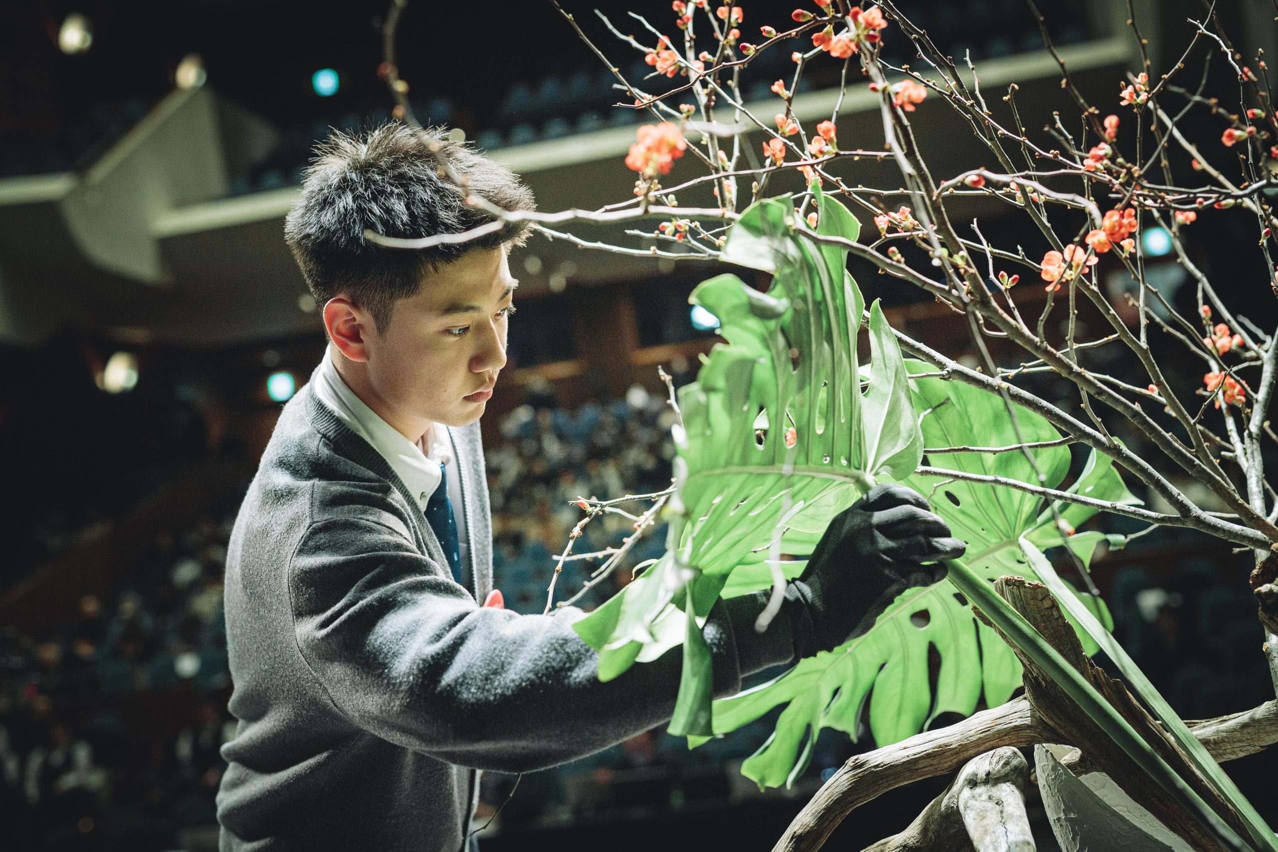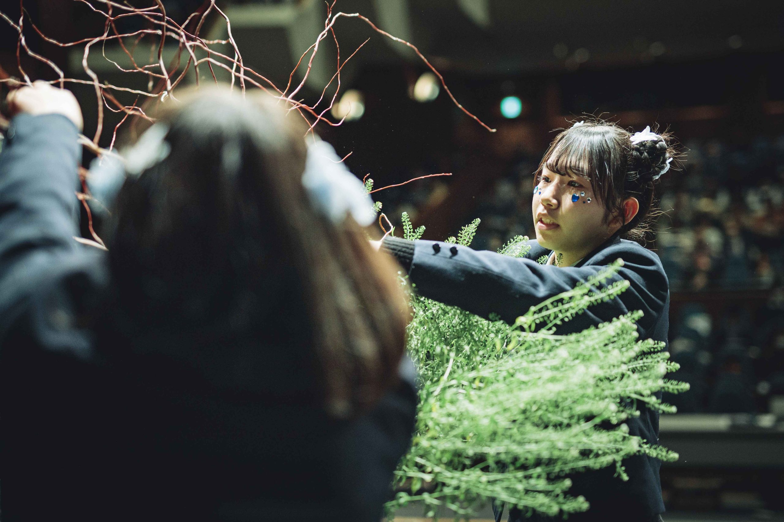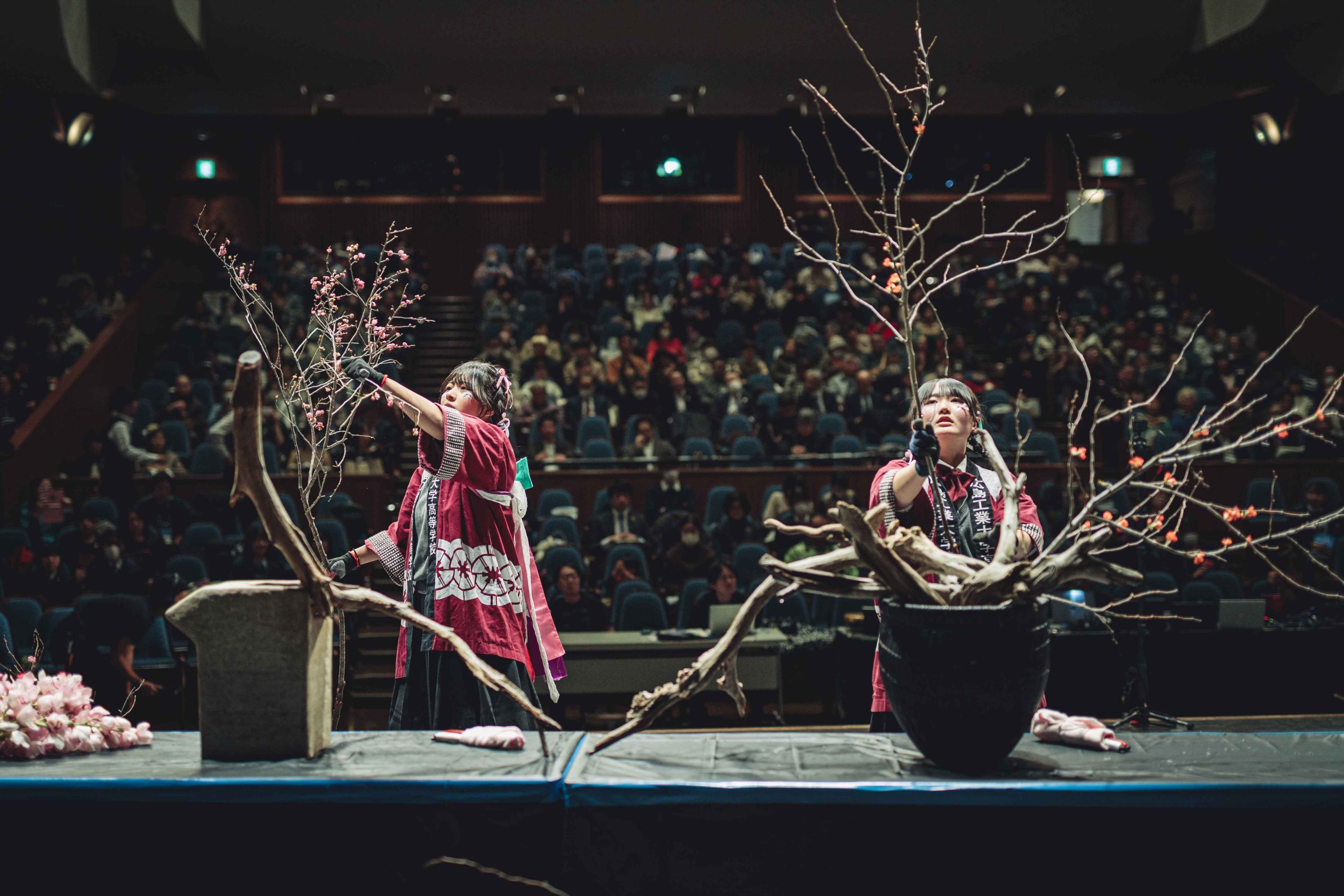 用意された花材は、香川県産のラナンキュラス、マーガレット、カーネーションミニティアラ、そして生産者が一ヶ月かけて満開に仕上げた「フルブルーム」の菊などをはじめとした全国の生産者様から届けていただいた124品目。高校生たちは、舞台を縦横無尽に駆け回り、慣れない大きな器やトリッキーな形状の流木に四苦八苦しながらも、即興で作品を組み上げていきます。