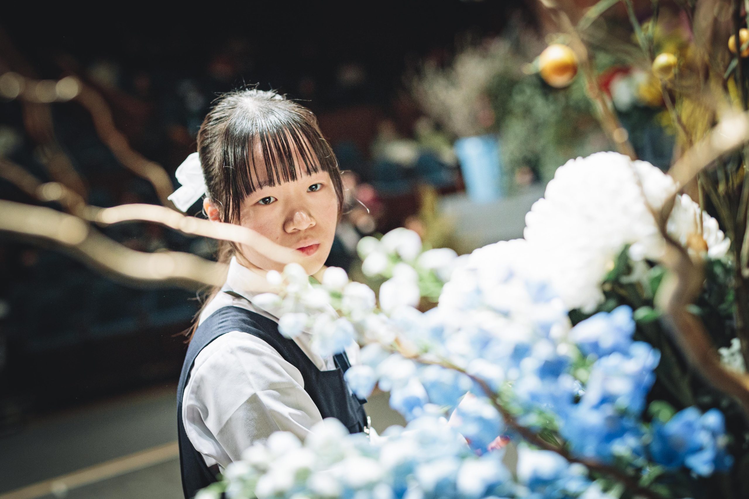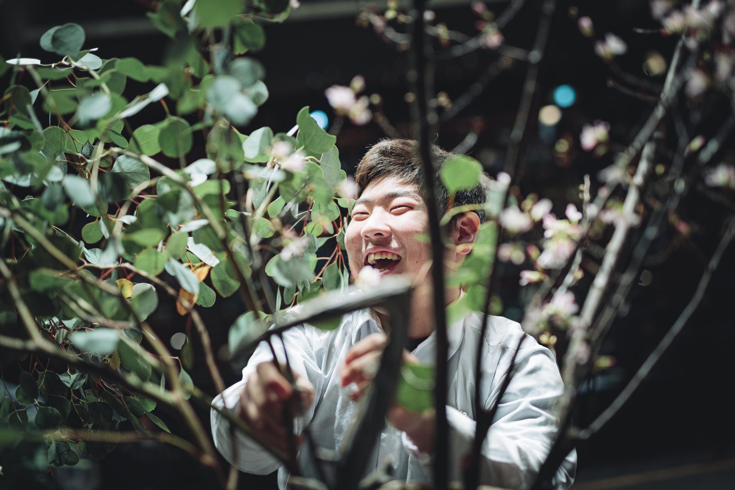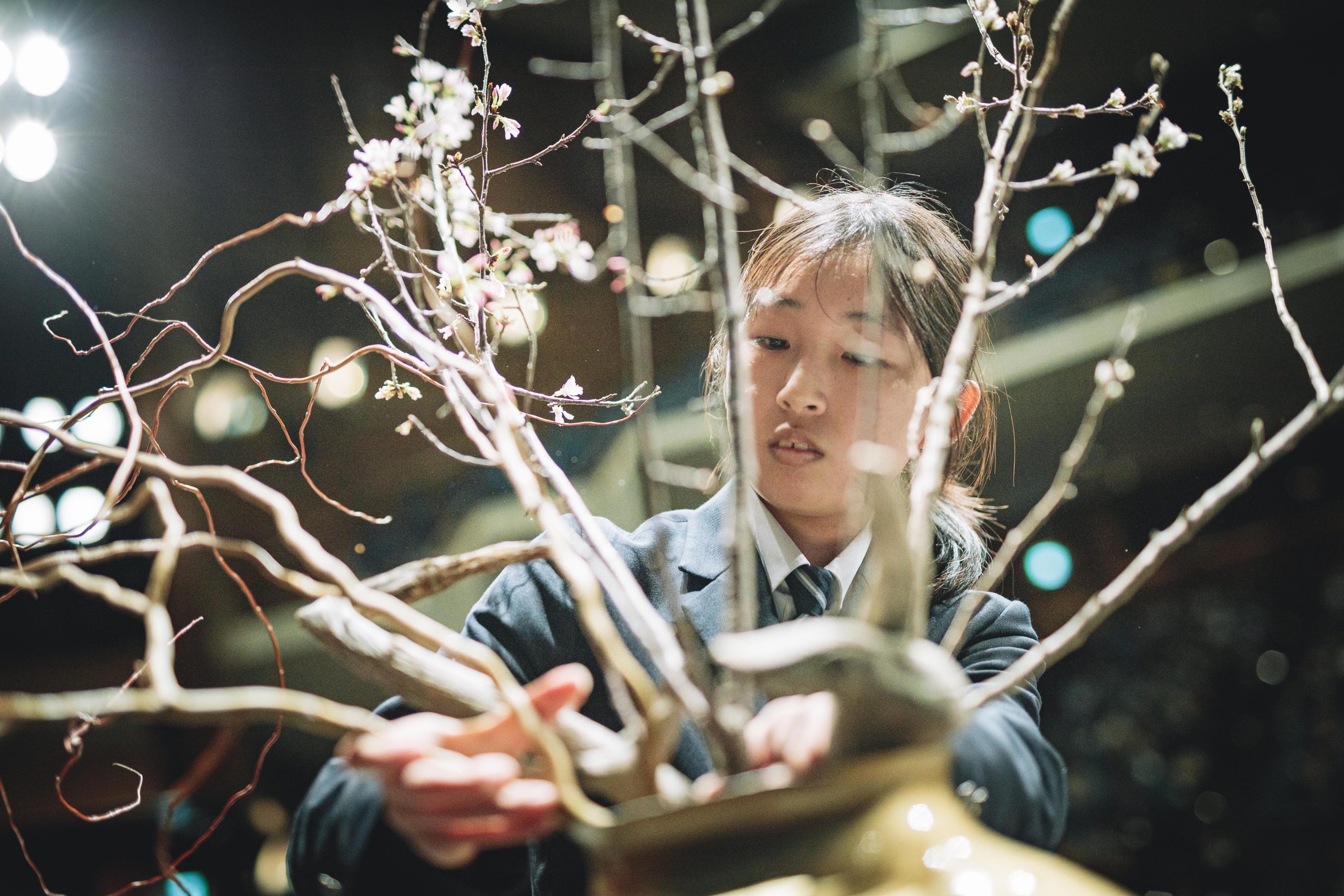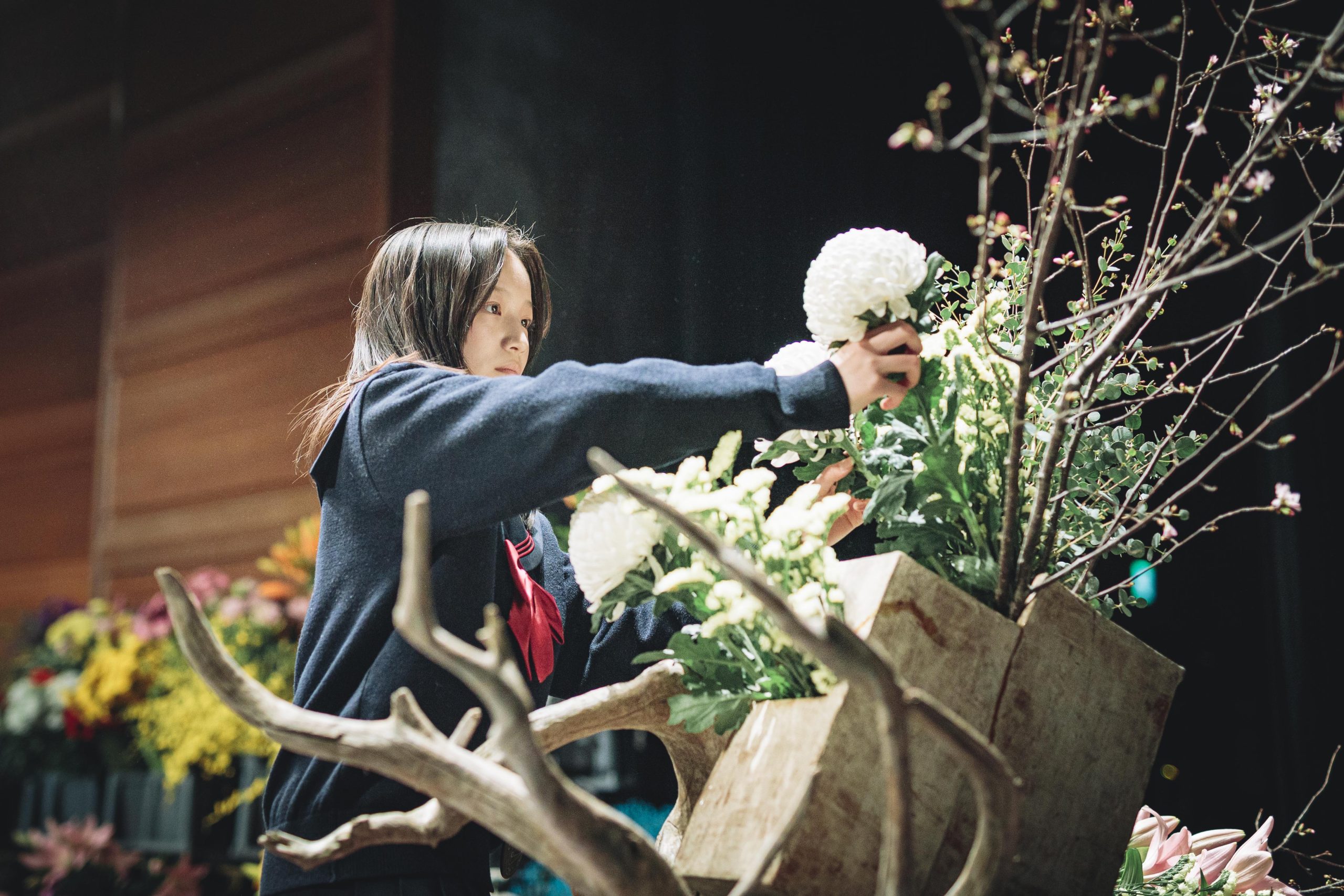 用意された花材は、香川県産のラナンキュラス、マーガレット、カーネーションミニティアラ、そして生産者が一ヶ月かけて満開に仕上げた「フルブルーム」の菊などをはじめとした全国の生産者様から届けていただいた124品目。高校生たちは、舞台を縦横無尽に駆け回り、慣れない大きな器やトリッキーな形状の流木に四苦八苦しながらも、即興で作品を組み上げていきます。
