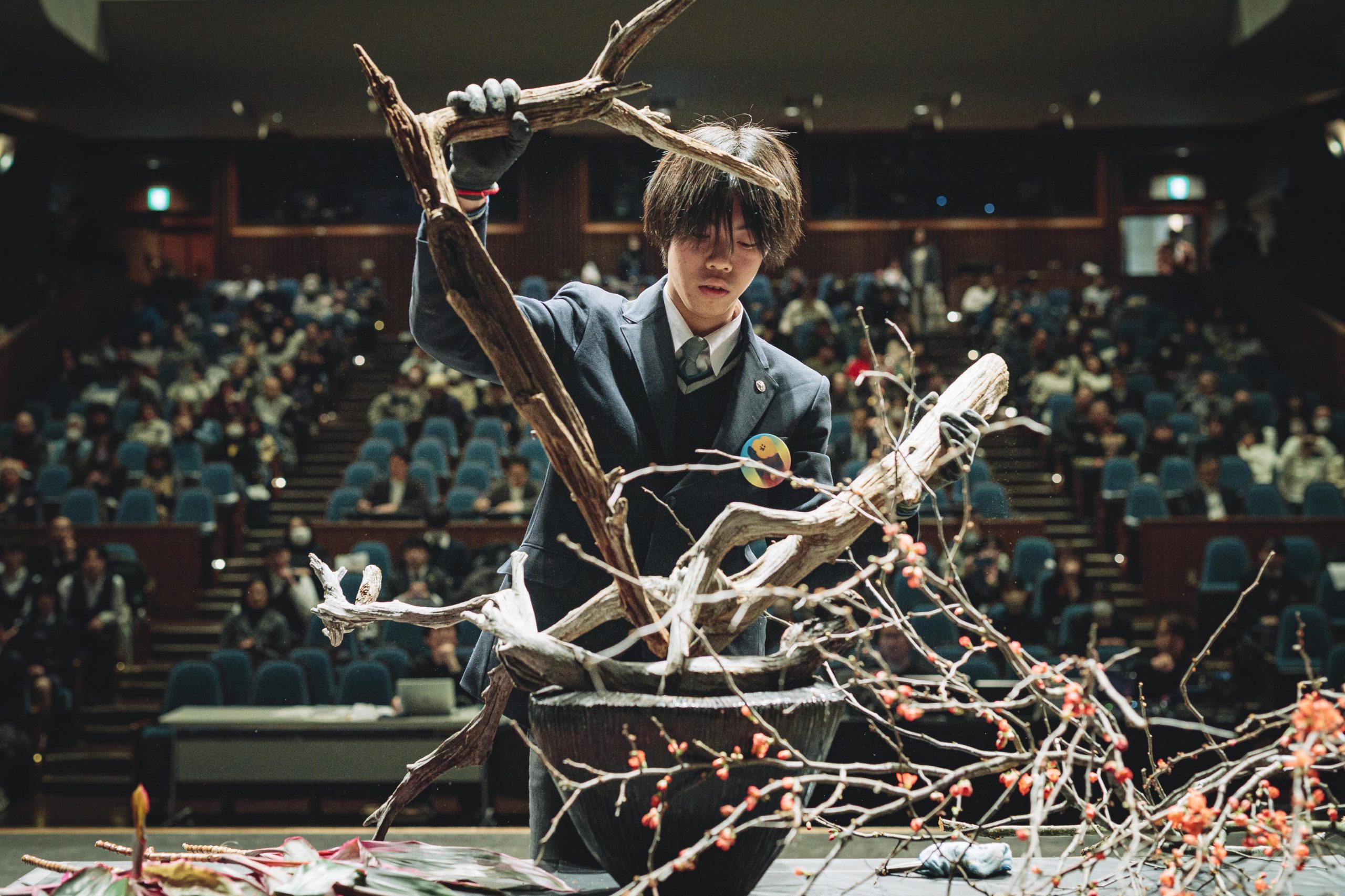 3位決定戦では、岐阜大会代表・岐阜県立岐阜商業高等学校「百はな」が、広島大会代表・広島工業大学高等学校「カンパニュラ」との激闘を制し、見事3位に輝きました。金の器に紅いボケの枝をあしらい、静かな情熱を込めて一枝ずつ丁寧に命を吹き込んでいく姿は、観客の心に深い感動を残しました。惜しくも4位となった広島代表の八田紗夢さんは、3年生として最後の舞台を終え、涙ながらにペアの小倉さんや支えてくれた方々へ感謝を伝える姿があり、会場は温かい拍手に包まれました。