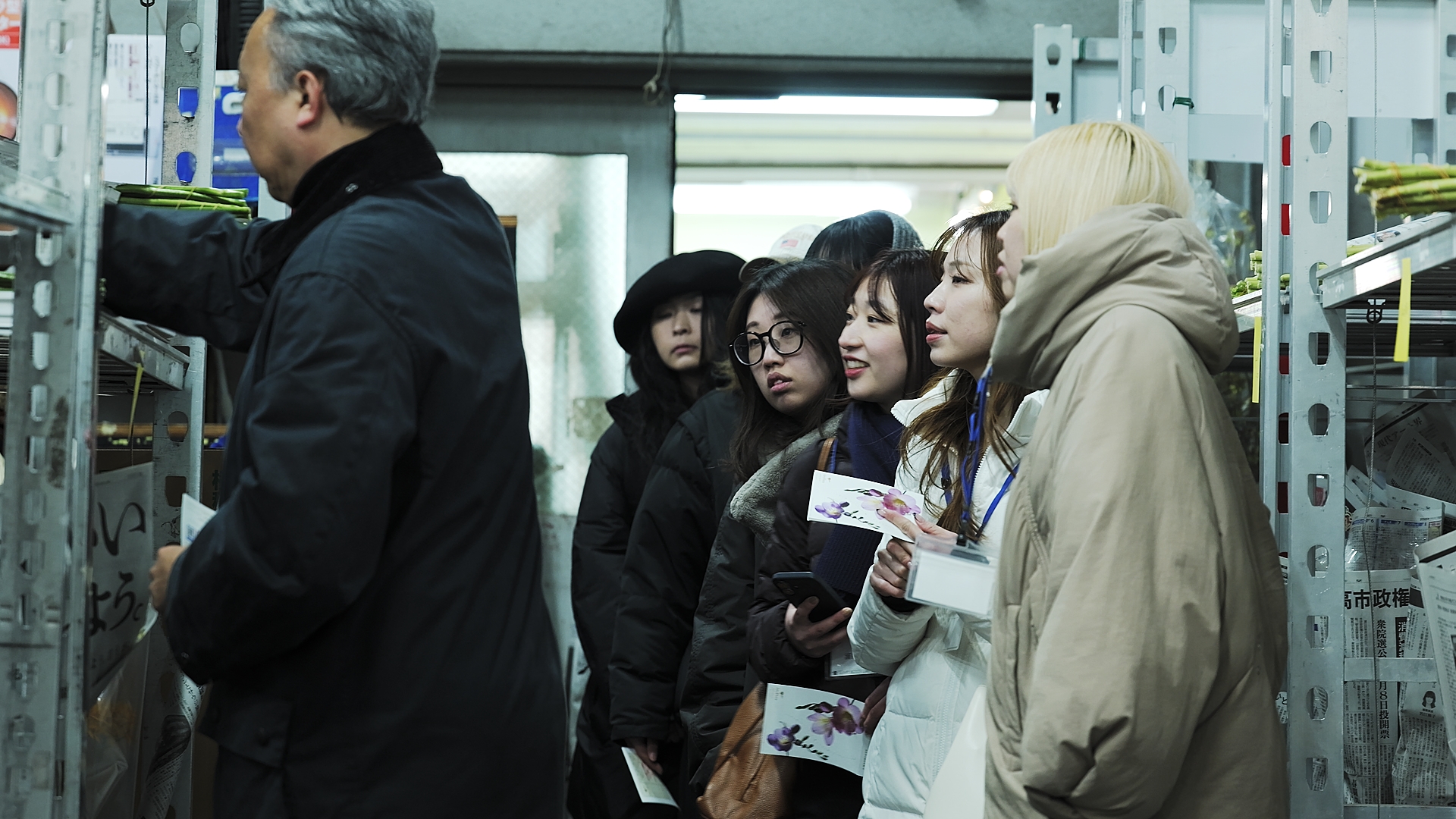 二〇二六年二月二十日、まだ朝の空気が冷たい午前七時半。日本一の花市場である東京都中央卸売市場大田市場花き部に、参加者たちが集まりました。旬の花材が所狭しと並ぶ宝庫のようなこの場所で、「花いけの会」で使用するための花材を、参加者自らの手で仕入れることからブートキャンプは幕を開けました。数え切れないほどの花の中から、今の自分の感性に響く一枝を自らの目で見極め、手に入れる。市場の活気と花の生命力に直接触れる実践的な仕入れは、これから始まる「花と向き合う二日間」への、静かな、けれど熱い決意を込める大切なプロローグとなりました。